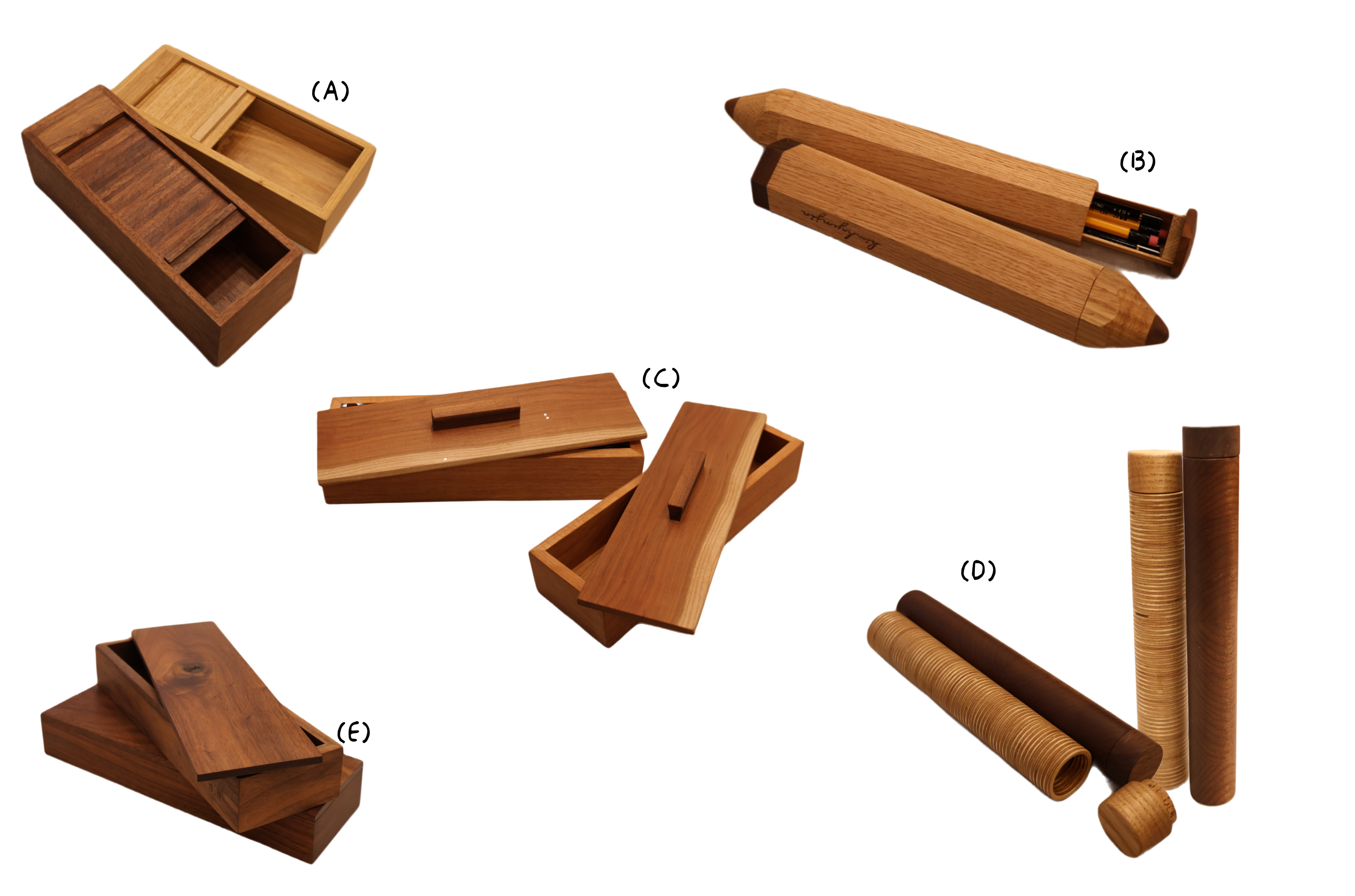 A. 드르륵 열었다 닫을 수 있는 필통입니다. 여러 개의 나뭇조각을 단단한 천에 붙여 유연성이 있게 만들지요. 가구에서도 볼 수 있는 이런 문의 형태는 tambour door라고 부릅니다. B. 연필의 모양을 크게 확대해 둔 것처럼 필통을 만들었습니다. 연필의 가장 위쪽을 오픈할 수 있는 형태로 보이지 않는 부분에 자석을 이용해 저절로 열려 쏟아지지 않게 했지요. 호두나무로 표현한 흑심까지 :) C. 긴 직사각형의 필통에 나무로 손잡이를 달아주니 필기구뿐만 아니라 아끼는 물건을 모두 넣어두고 싶어집니다. 체리나무는 색의 경계가 있는 부분을 사용했는데 자연스러운 색의 어울림이 보기 좋았어요. D. 자작나무 합판의 단면은 그것만의 특별한 색감이 있지요. 둥글게 파듯이 만든 원통들을 연결해 뚜껑까지 만들어 동글동글 막대 같은 간편한 필통을 만들어보았습니다.