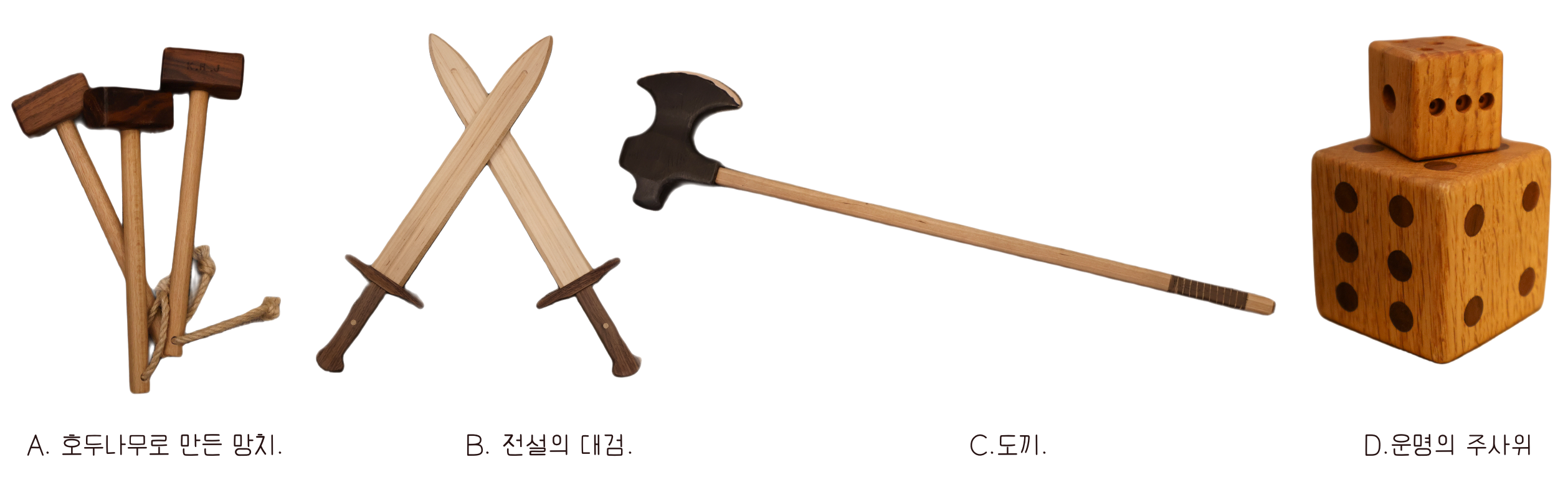 A. 호두나무에 참나무를 쐐기로 박아 튼튼하게 만든 귀여운 나무망치. B. 정의의 용사님이라면 하나씩은 지니고 있는 대검. 단풍나무 칼날에 손잡이를 호두나무로 만들었습니다. 칼자루를 손잡이 안쪽으로 박아서 목심으로 고정해 더욱 견고합니다. C. 도끼날의 디테일한 모양은 아이의 눈이 휘둥그레지게 만들었고 날끝에 철물이 갈아진 듯 물결무늬는 아이가 직접 채색해서 더욱 섬세하게 표현되었어요. D. 운명의 주사위를 던져 정의의 대결을 시작합니다.